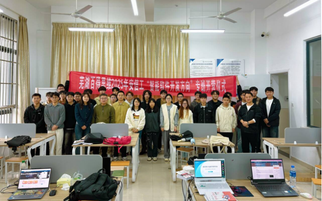 10月31日上午,工业互联网产业学院智能软件开发方向举办了一场以“产教融合新模式探索”为主题的特色活动。芜湖百得思维人事经理余明珠、项目经理杨康康、产品经理形小开等企业代表与优秀校友共同走进课堂,与在校学生展开面对面交流,分享成长经验与职业发展路径,并就未来校企合作方向展开深入洽谈,为人才培养注入新活力。 (图为现场合影)活动伊始,企业代表、授课教师及首批学生共同合影留念,标志着企业正式融入学院教学体系。余明珠以“从校园到职场的无缝衔接”为题,系统介绍了公司的发展历程、主营业务、企业文化及其在行业内的领先地位。通过图文并茂的PPT展示与真实案例分享,同学们对企业的运营模式与实际工作环境有了更加直观的了解。“我们不仅关注学生的专业技能,更看重责任心、团队协作能力与持续学习的潜力。”余明珠在发言中强调,企业愿为有潜力的年轻人搭建成长平台,并就实习转正、薪酬体系、五险一金、带薪培训和职业晋升通道等学生普遍关心的问题进行了细致解读。(图为余经理现场讲解) 本次活动还特别邀请了毕业于该校、现已在职
